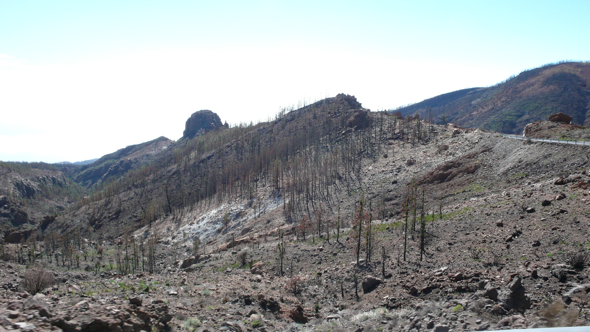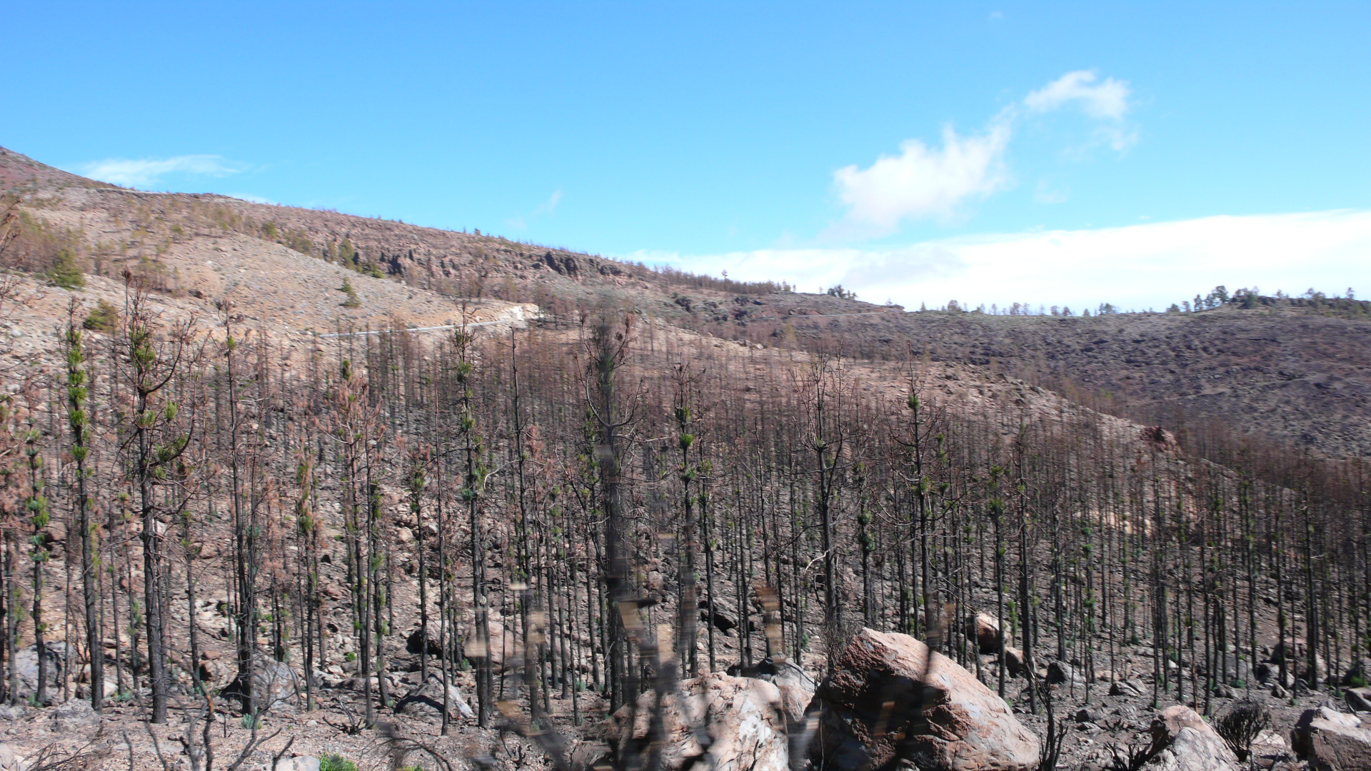 Trunks of the endemic Canary Island Pine Tree (Pinus canariensis) were blackened and showed very little foliage: