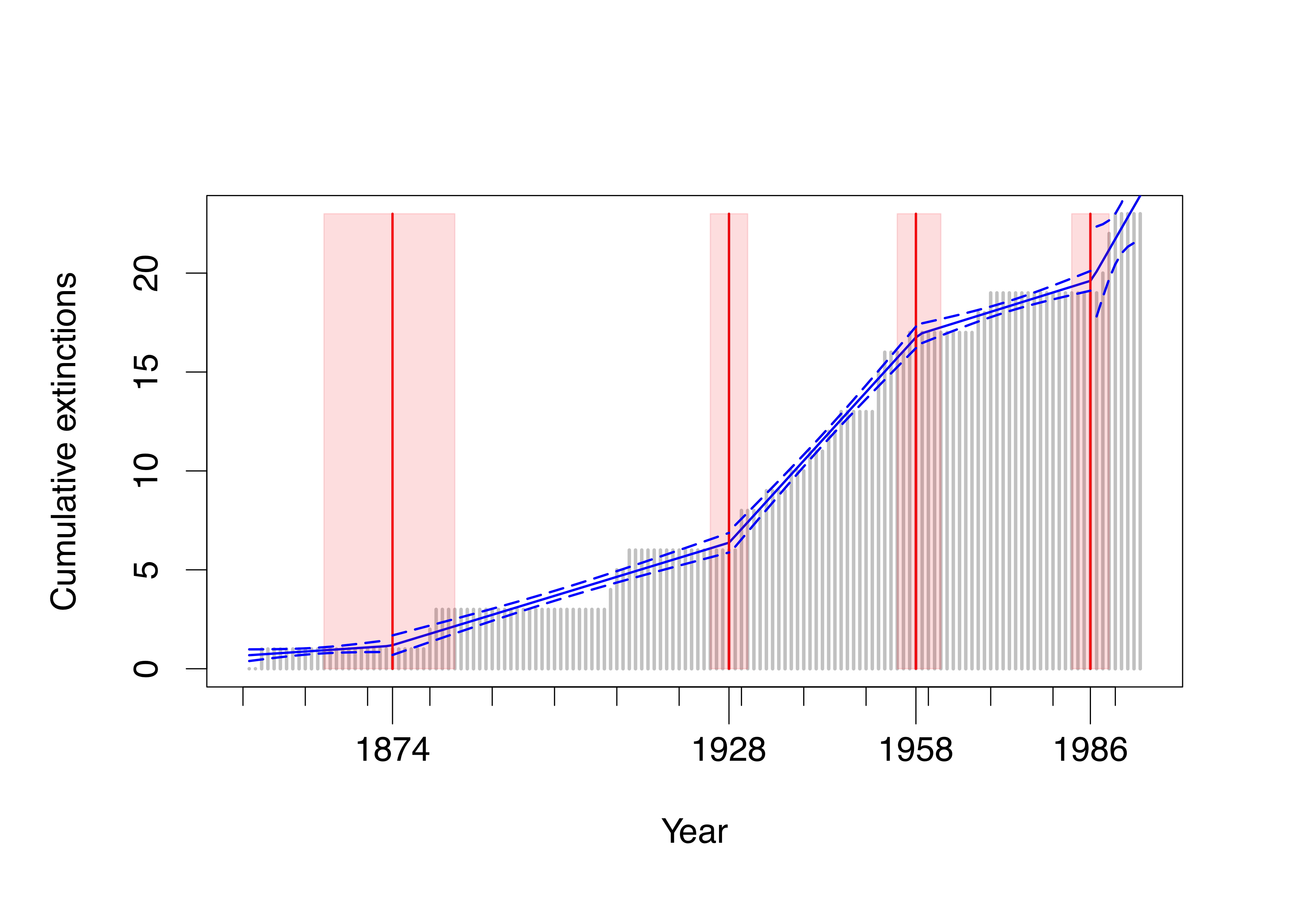 The four periods marked in red are the points where we estimate the rate of extinction changed (with 99% confidence intervals shown in pink).  The most rapid rate of extinction (shown by the solid blue piecewise regression lines and dashed 99% confidence intervals) is from the late 1920s to the late 1950s.  This, we believe, is the cumulative effect of agricultural changes precipitated and then augmented by the First and the Second World Wars, respectively.