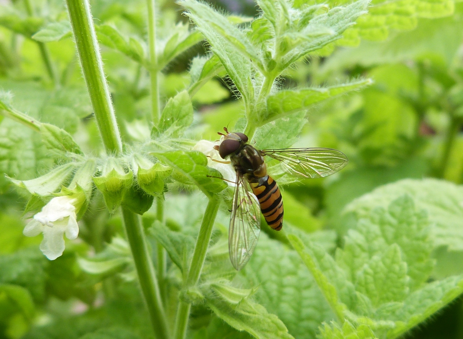 Syrphid on lemon balm 1 cropped - 1P1020548 copyOne of the most frequently encountered of hoverfly species in urban gardens is the beautifully named Marmalade hoverfly (Episyrphus balteatus).  This insect is a “true fly” of the order Diptera that is sometimes confused with superficially similar wasps (order Hymenoptera), though (as the common name suggests) the species is translucent orange and black in colour rather than waspish yellow and black.  It also has a very flat abdomen whereas wasps are rounded, and they certainly don’t sting.