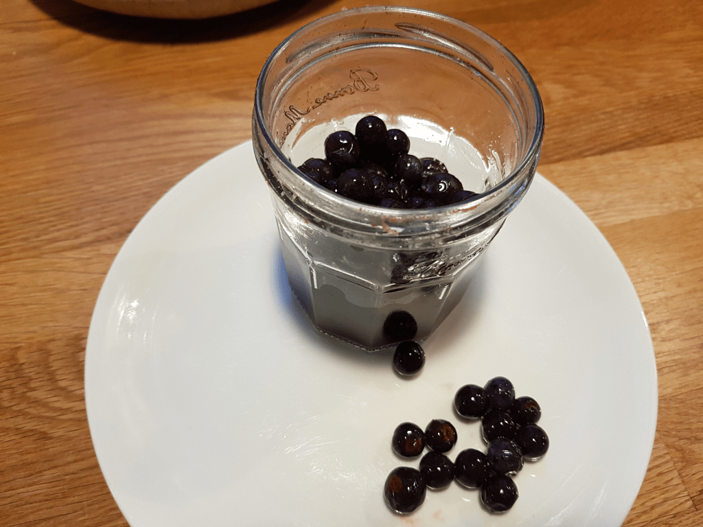 Wash and rinse a glass jar with a tight fitting lid, which is equal to the capacity of the sloes but no more, i.e. you want the sloes to fill it to the top. Sterilisation shouldn’t be necessary as the conditions inside will not be suitable for growth of anything other than the Lactobacillus. But it’s best to rinse out any detergent.