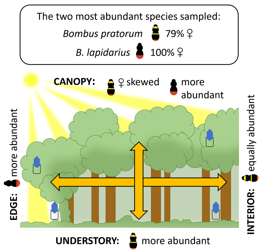 A significant proportion of bee abundance was found in the canopy, represented by 23 of the 29 total sampled species. Interior canopy activity was much higher when nectar-producing Sycamore (Acer pseudoplatanus) trees were nearby. Communities differed between the canopy and understory: of the seven most common species sampled, three were more active in the understory, while the opposite was true of one species – Bombus lapidarius. Interestingly, we found the sex ratio of the most abundant species – B. pratorum – to be female-skewed in the canopy. For four of these species, and contrary to expectations, we found no evidence that understory activity was any higher at woodland edges compared to woodland interiors.
