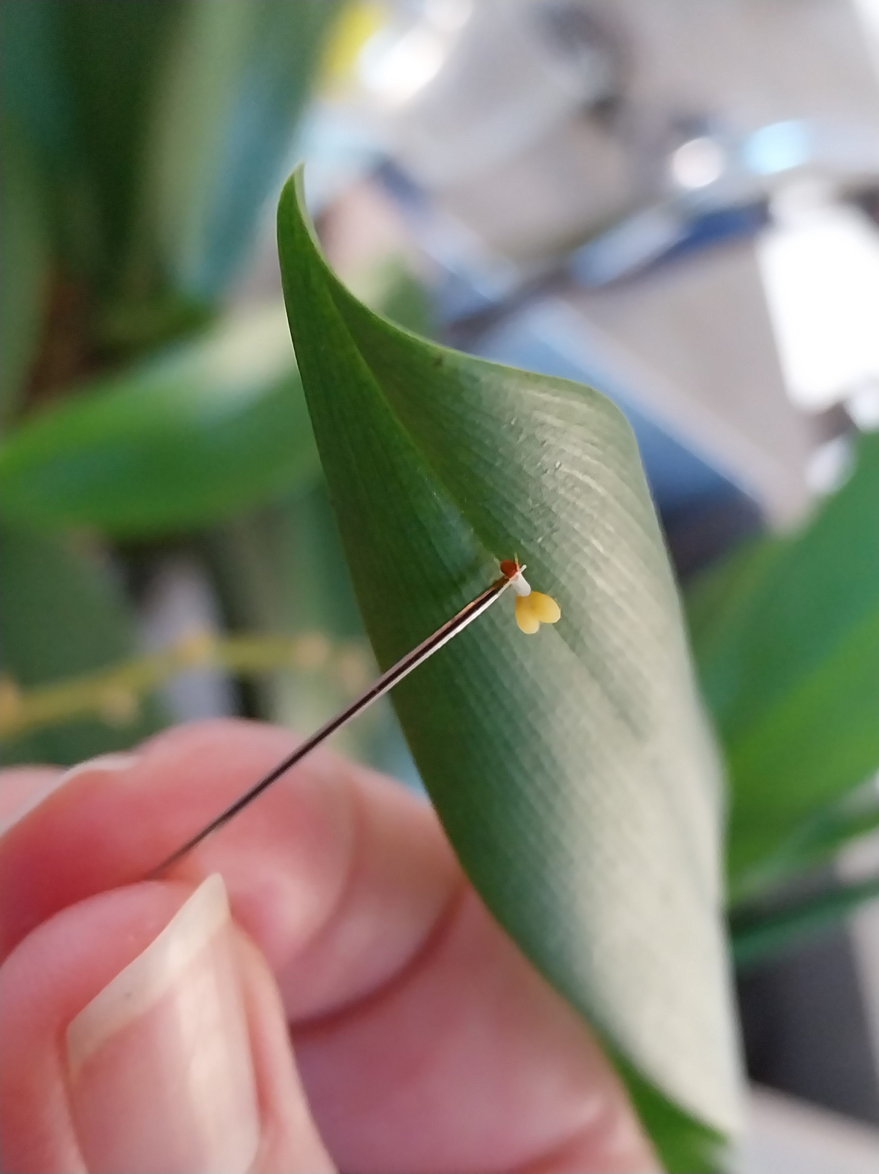 If you want to look at this yourself, you’ll find the pollinaria tucked under the front of the central “column” of the flower, which comprises the fused male and female reproductive parts. Just take a fine needle and gently stroke the underside of the column. In the image below, taken just after we extracted the pollinarium, you can see the “anther cap” which covered them lying just below the column.
