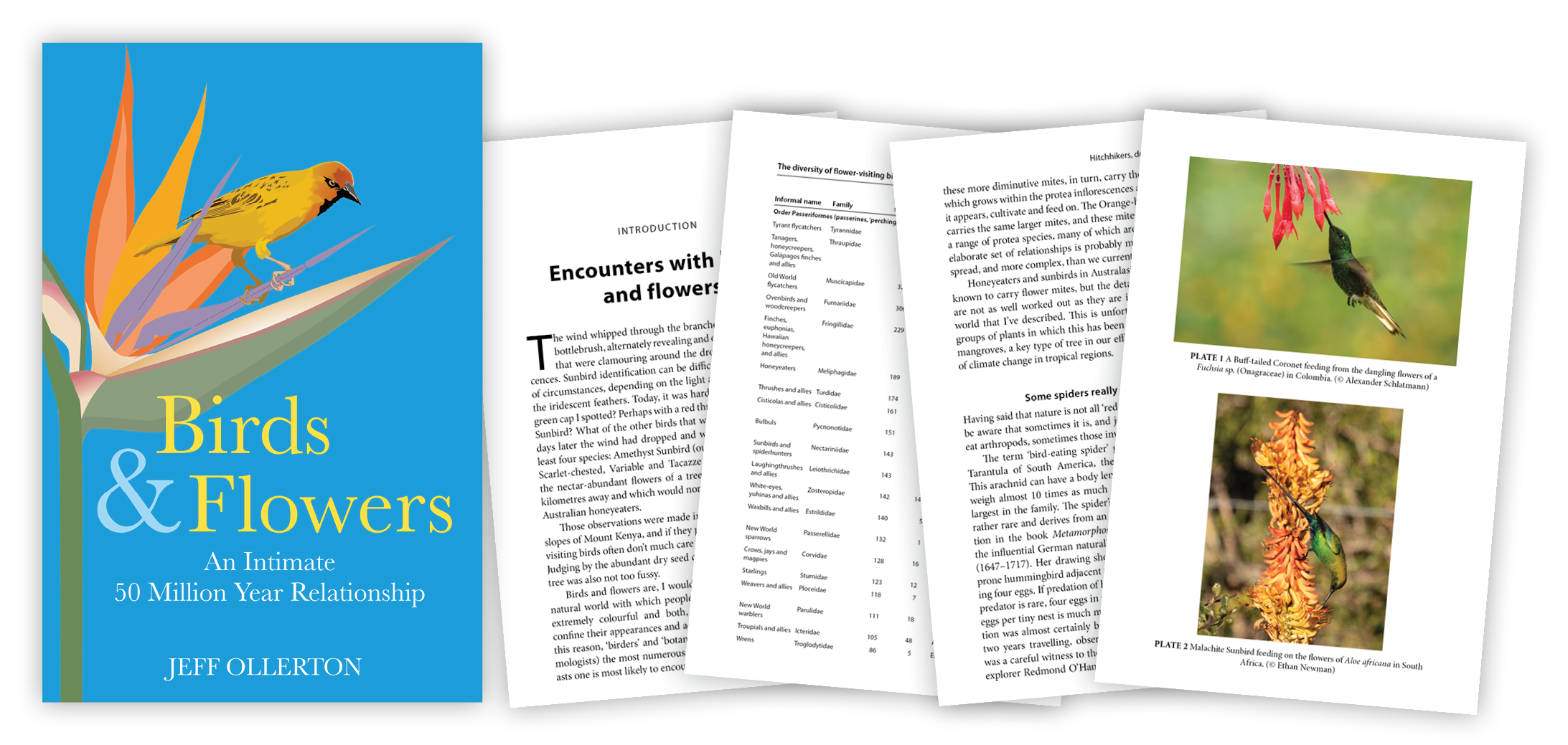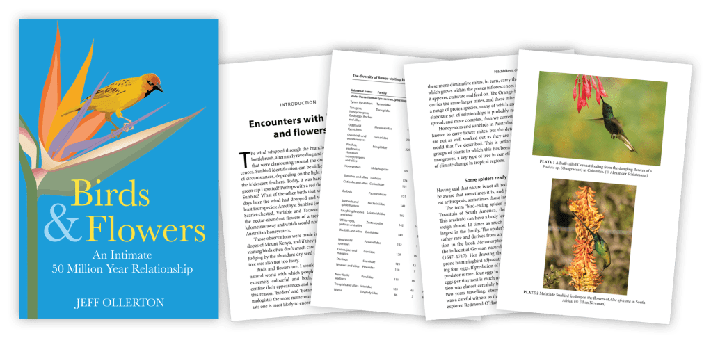 Birds & Flowers: An Intimate 50 Million Year Relationship is my latest book, published by Pelagic in March 2024. It’s available from all the usual places where you buy books, or direct from the publisher. It’s the first book to deal with birds as pollinators in their entirety, i.e. going beyond the usual culprits of hummingbirds, sunbirds, and honeyeaters.