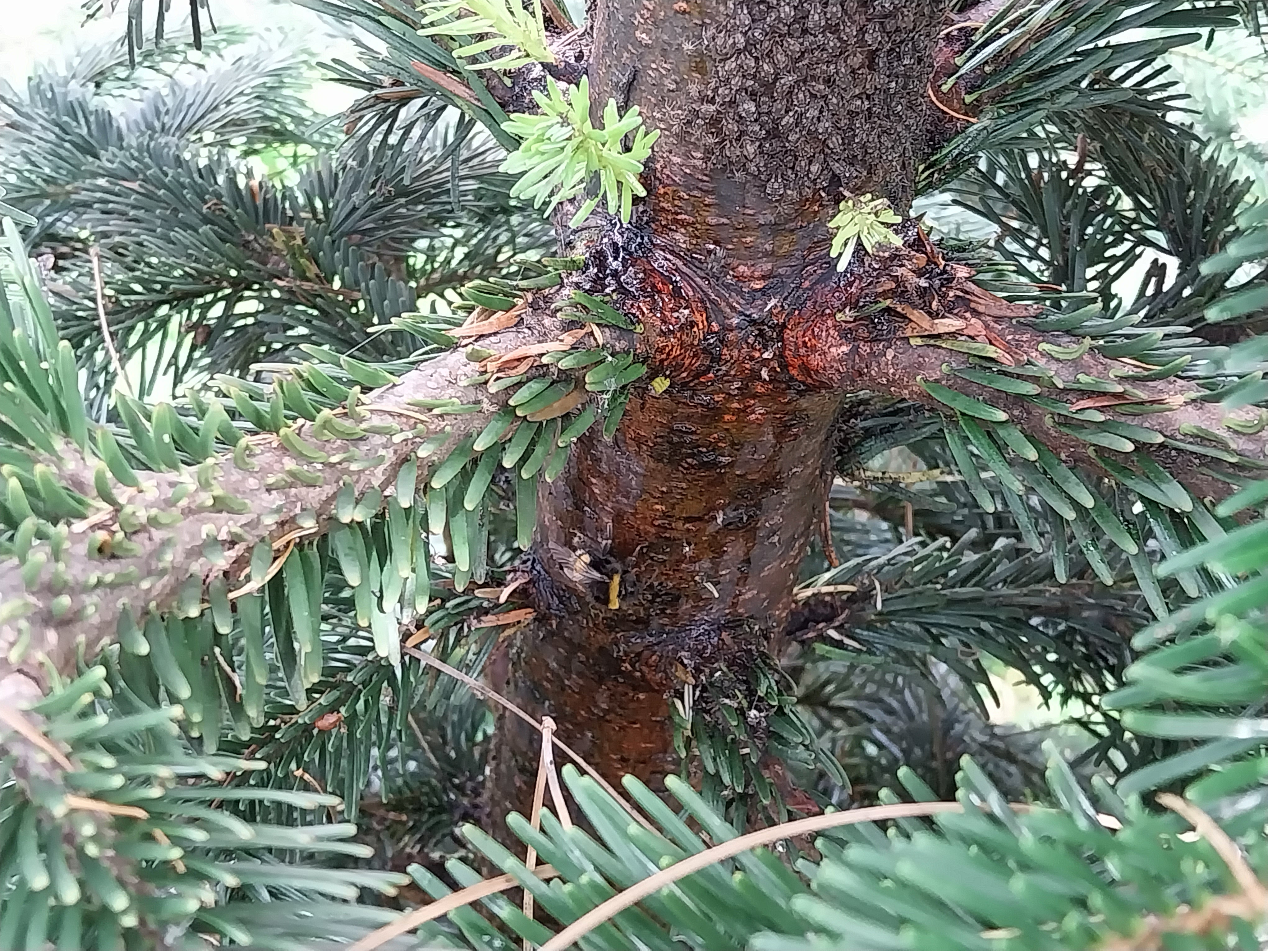 At the moment Karin and I are in the UK for a couple of weeks. I had work to do as an external examiner at the University of Swansea, plus we wanted to catch up with some family and friends. Our main base has been the home of our mates Ian and Simone and we’ve enjoyed some warm, muggy evenings sitting in their garden chewing the fat. Every now and again my eyes have been drawn to the activities of bumblebees as they move in and out of the foliage of a small Silver Fir. The bees are attracted to the large colonies of an aphid that is feeding on the tree’s trunk, from which they are collecting honeydew, as you can see in the photograph above.