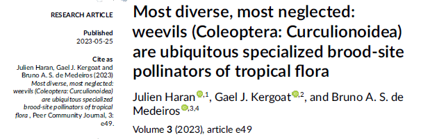 Writing in the open access Peer Community Journal, Julien Haran, Gael Kergoat, and Bruno de Medeiros have produced a really fascinating review of weevil pollination called: