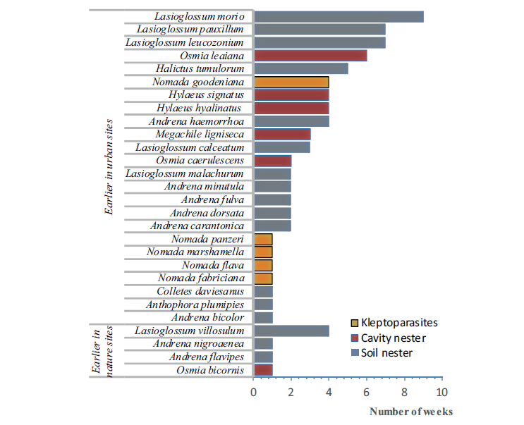 “We observed a substantial effect of urban microclimate on bee flight periods. A total of 153 individuals of nine bee species were recorded one to nine weeks before or after their expected flight periods. In contrast, only 14 individuals of four species were seen at unusual flight periods in nature sites.”