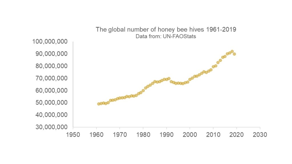 What are we to make of this? In an analogy with peak oil, why do we seem to have passed ‘peak honey bee’? If this is a real pattern (and only time will tell) I suspect that it’s because of at least two factors. The first is that interest in beekeeping reached a peak in the early 2020s, after which some initial enthusiasts discovered that beekeeping is actually quite a technical and demanding hobby, and gave it up. The second factor is that word has spread that , globally, managed Western honey bees are not declining, and too many bee hives in an area can have negative impacts on other, wild pollinators. This may have impacted those people who were persuaded by “Save the Bee” campaigns to take up the hobby, to give up beekeeping.