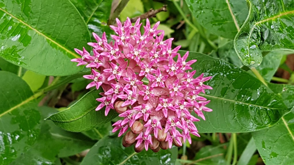 As you can see in the image above, these orchids package their pollen into discrete structures that we term “pollinia” – two of them in this case, though the form and number of pollinia vary between different groups of orchids. The pollinia plus the sticky organ that attaches them to a pollinator is collectively termed a “pollinarium”. The only other plants that present their pollen in this way are my beloved asclepiads in the family Apocynaceae. The orchids and the asclepiads are only very distantly related to each other so this is a clear example of convergent evolution, where both plant groups have come up with the same solution to a problem. In this case, the problem is probably that bees collect a lot of pollen which has a reproductive cost for plants. Packaging the pollen in this way prevents bees from stealing it, amongst other advantages.